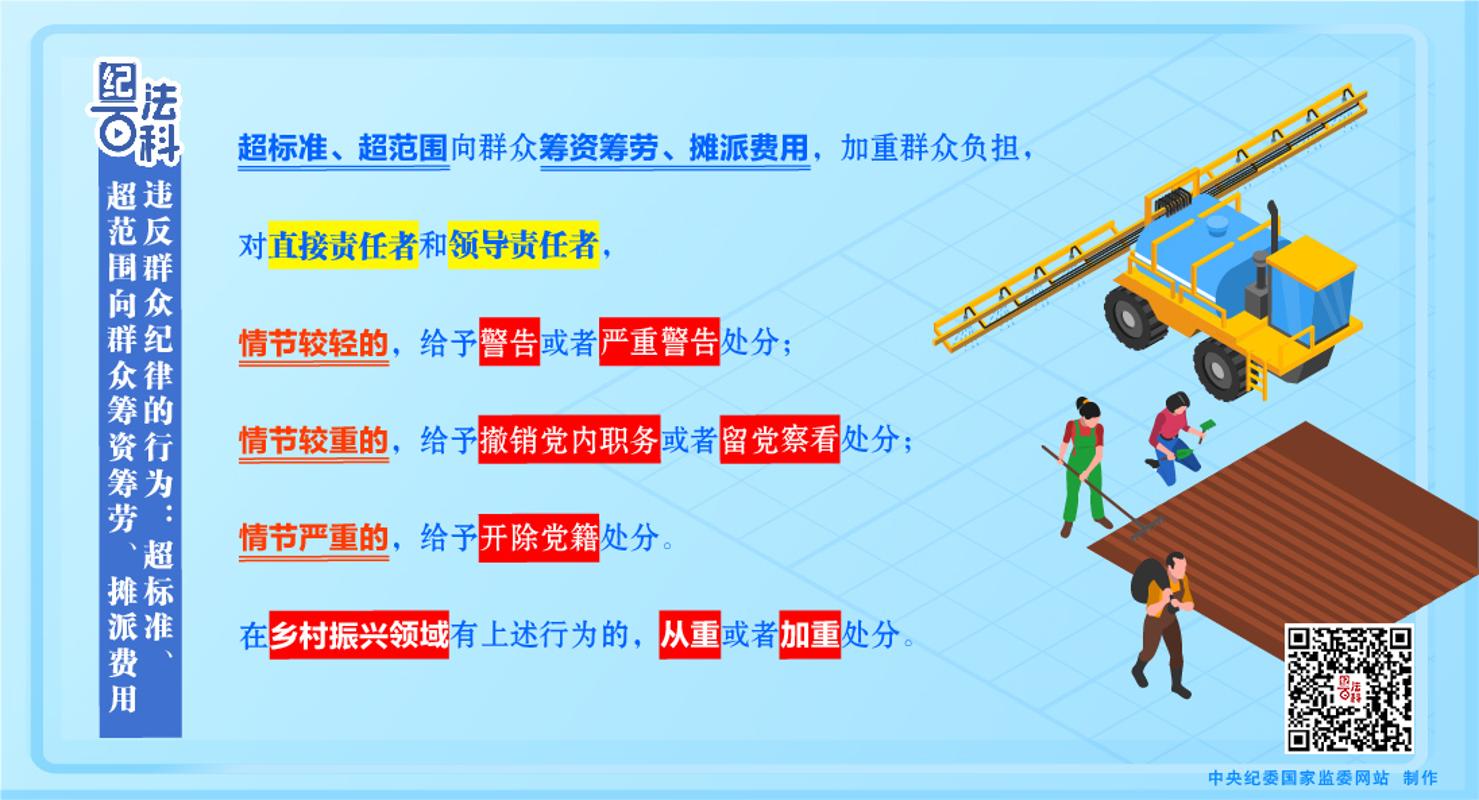 《中国共产党纪律处分条例》第一百二十二条、第一百二十三条对侵害群众利益行为列出负面清单,作出处分规定。第一百二十二条第一款规定:有下列行为之一,对直接责任者和领导责任者,情节较轻的,给予警告或者严重警告处分;情节较重的,给予撤销党内职务或者留党察看处分;情节严重的,给予开除党籍处分,其中第一项为“超标准、超范围向群众筹资筹劳、摊派费用,加重群众负担”。第二款规定:在乡村振兴领域有上述行为的,从重或者加重处分。